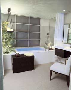 The mezzanine level of the Kohler Design Center features 25 model kitchens and baths. Pictured is the Aquaessence room, designed by Laura Bohn.