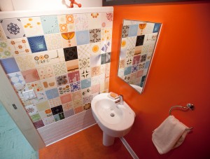 The studio bathroom is decorated with 1970s tiles from Buenos Aires.